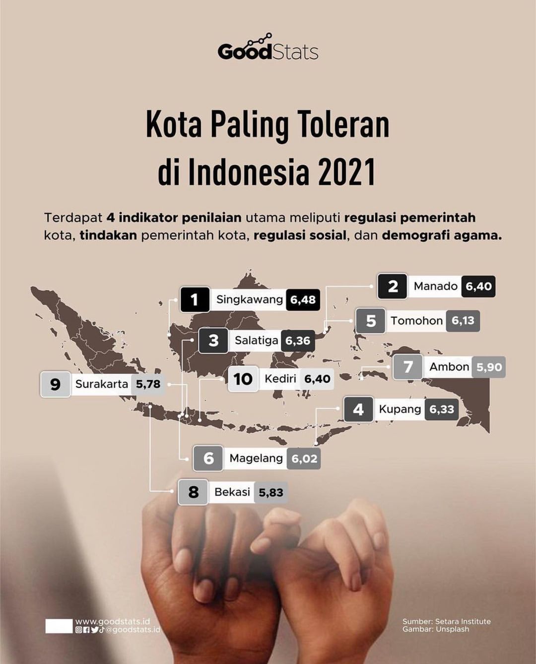 Dilansir dari Goodstats.id , Setara Institute merilis daftar kota paling toleran di Indonesia tahun 2021 dalam Laporan Indeks Kota Toleran (IKT) 2021.